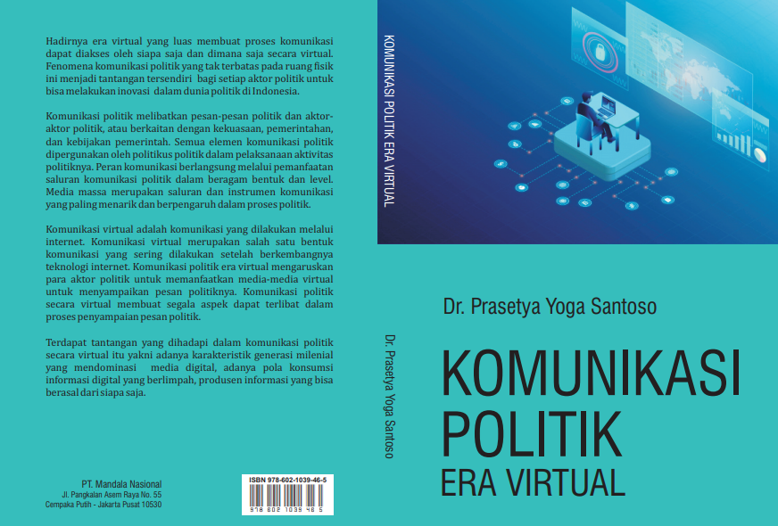 | DEKSRIPSI | Komunikasi virtual adalah komunikasi yang dilakukan melalui internet. Komunikasi virtual merupakan salah satu bentuk komunikasi yang sering dilakukan setelah berkembangnya teknologi internet. Komunikasi politik era virtual mengaruskan para aktor politik untuk memanfaatkan media-media virtual untuk menyampaikan pesan politiknya. Komunikasi politik secara virtual membuat segala aspek dapat terlibat dalam proses penyampaian pesan politik. ISBN: 978-602-1039-46-5 |