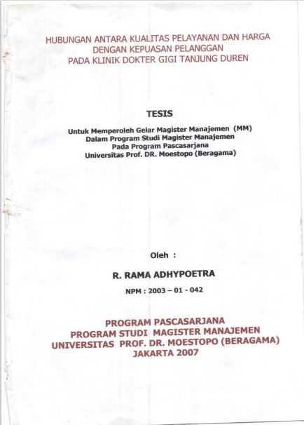 | JUDUL | 2007 | TESIS RAMA ADHYPOETRA : HUBUNGAN ANTARA KUALITAS PELAYANAN DAN HARGA DENGAN KEPUASAN PELANGGAN PADA KLINIK DOKTER GIGI TANJUNG DUREN |