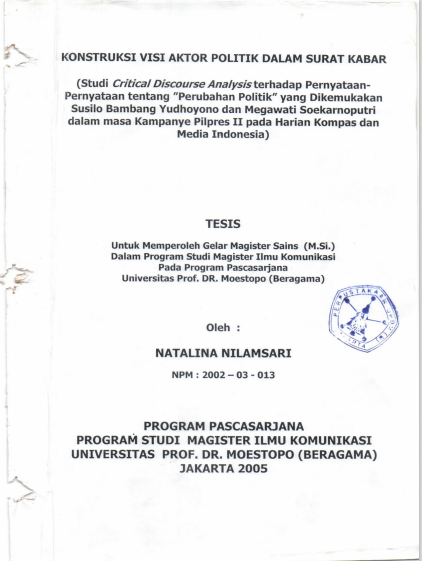 JUDUL 2005 | TESIS NATALINA NILAMSARI : KONSTRUKSI VISI AKTOR POLITIK DALAM SURAT KABAR (Studi CriticaI Discourse AnaIysis terhadap pernyataan - Pernyataan tentang "Perubahan Politik" yang Dikemukakan Susilo Bambang Yudhoyono dan Megawati Soekarnoputri dalam masa Kampanye Pilpres II pada Harian Kompas dan Media Indonesia)
