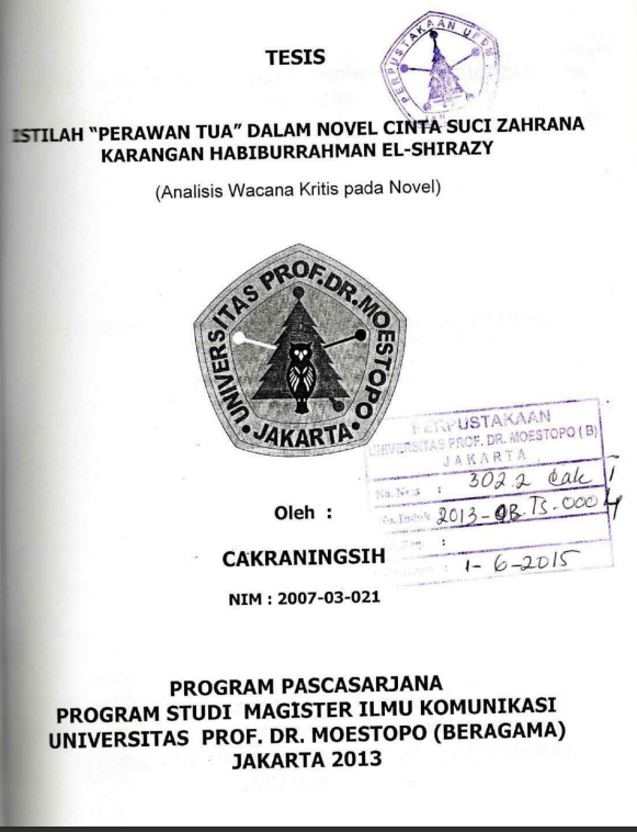 JUDUL 2013 | TESIS CAKRANINGSIH : ISTILAH "PERAWAN TUA" DALAM NOVEL CINTA SUCI ZAHRANA KARANGAN HABIBURRAMAN EL-SHIRAZY (ANALISI WACANA KRITIS PADA NOVEL)